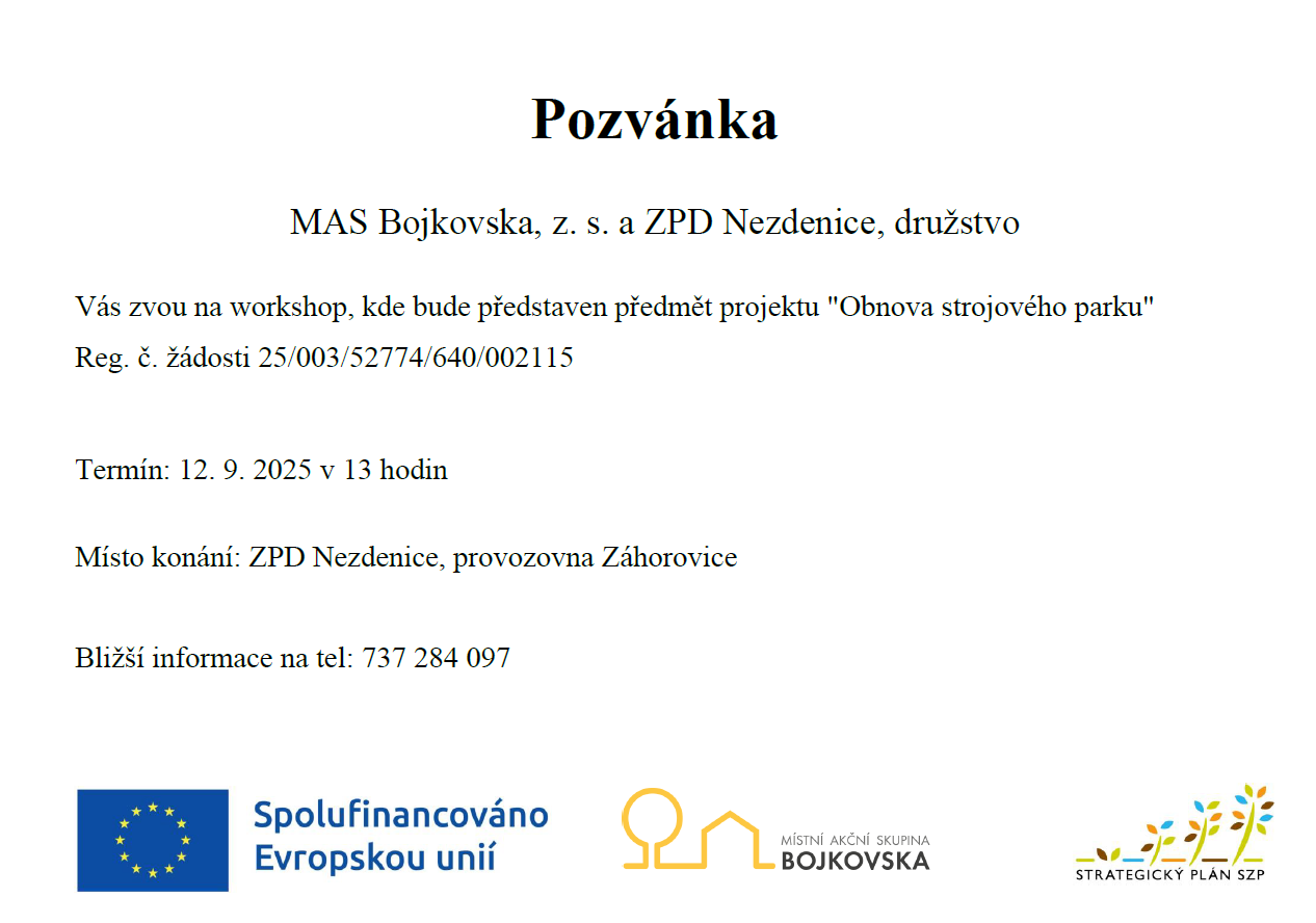 MAS Bojkovska, z. s. a ZPD Nezdenice, družstvo Vás zvou na workshop, kde bude představen předmět projektu "Obnova strojového parku".