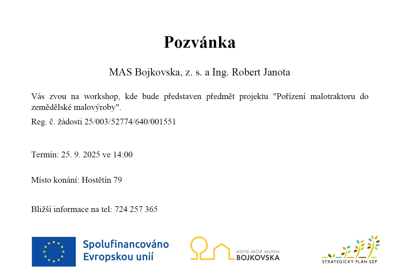 MAS Bojkovska, z. s. a Ing. Robert Janota Vás zvou na workshop, kde bude představen předmět projektu "Pořízení malotraktoru do zemědělské malovýroby".